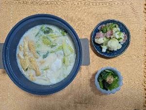 白菜400g、(タラ2切れ200g・塩少量)油揚げ2枚。