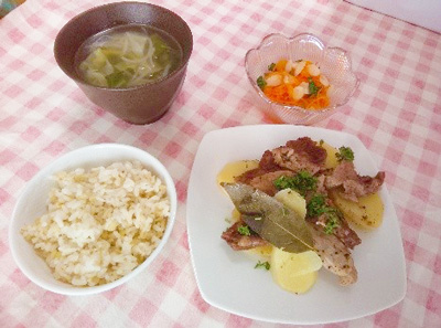 じゃが芋3個 豚ももかたまり肉200g パセリみじん切り少々 ニンニク1/2 塩胡椒少々 オリーブ油大さじ1 ローリエ2枚 白ワイン大さじ2
